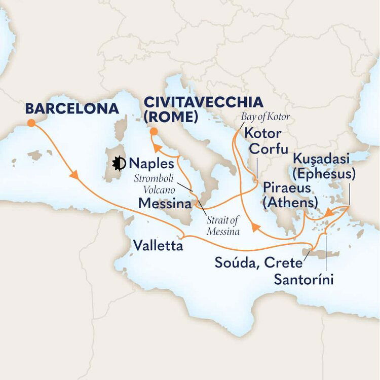 Souda Bay’s huge natural harbour is a spectacular entrance to Greece's largest island, Crete. Packed with beautiful beaches and rich maritime history, Crete is also a treasure trove of well-stocked museums, rich archaeological sites and charming Venetian fishing towns. Ships will dock at the Port of Souda.