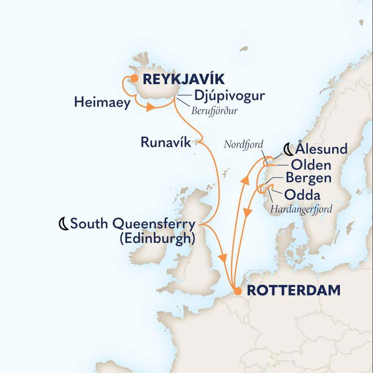 Located in the chilly and wild North Atlantic, it is common to see whales and seals in the surrounding waters. Puffins are also a common sight in summer, as the islands are considered as the largest Atlantic puffin colony in the world. Ships will dock in the main harbour.