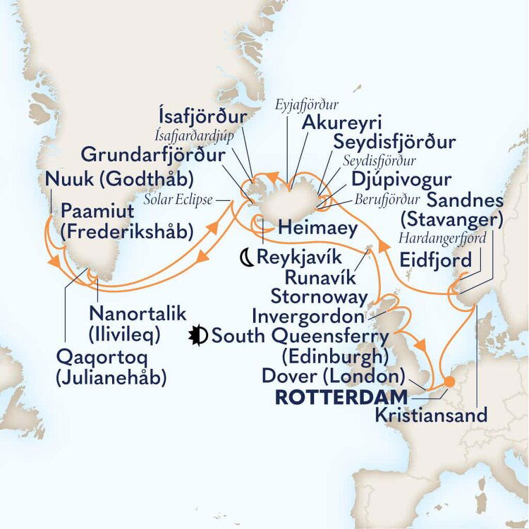 Nanortalik is located on a small island in the southern tip of Greenland. It is an adventurer's wonderland with vertical cliff walls, sheets of floating sea ice and a plethora of Arctic wildlife, including seals and Minke, humpback and fin whales. Sometimes polar bears can also be spotted on the offshore flow of ice. Ships will anchor offshore and tender guests to shore.
