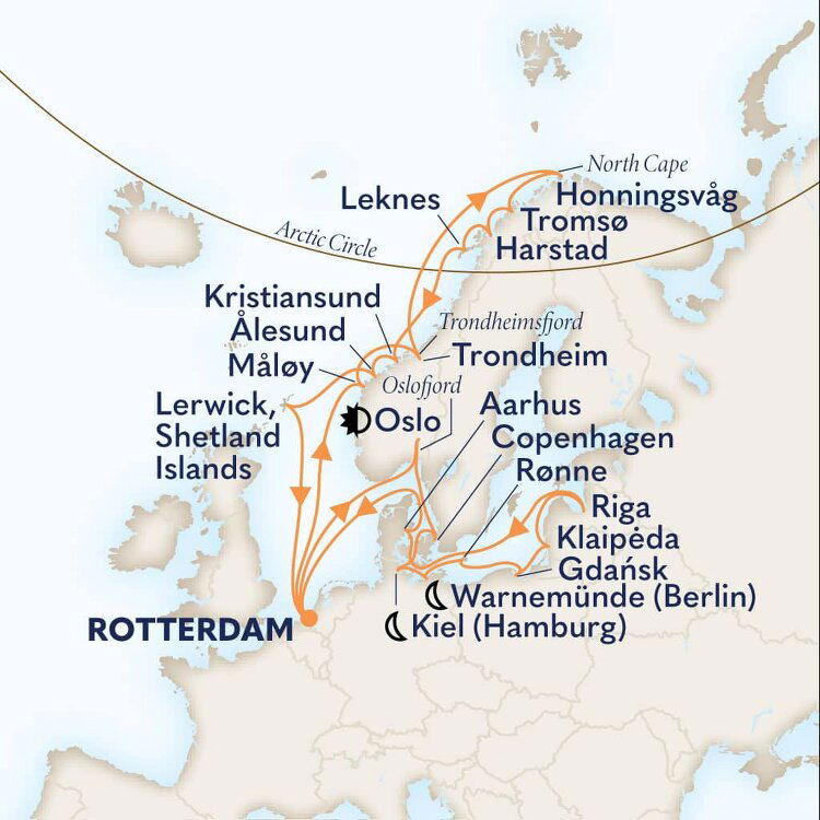 A colourful, historic capital of Norway, Trondheim's history reaches back to 997 AD. It may be Norway's third-biggest city, but there's a welcoming and intimate feel here, with a photogenic waterfront, and glowing wooden warehouses adding old-time charm. Ships will dock in the port of Trondheim.