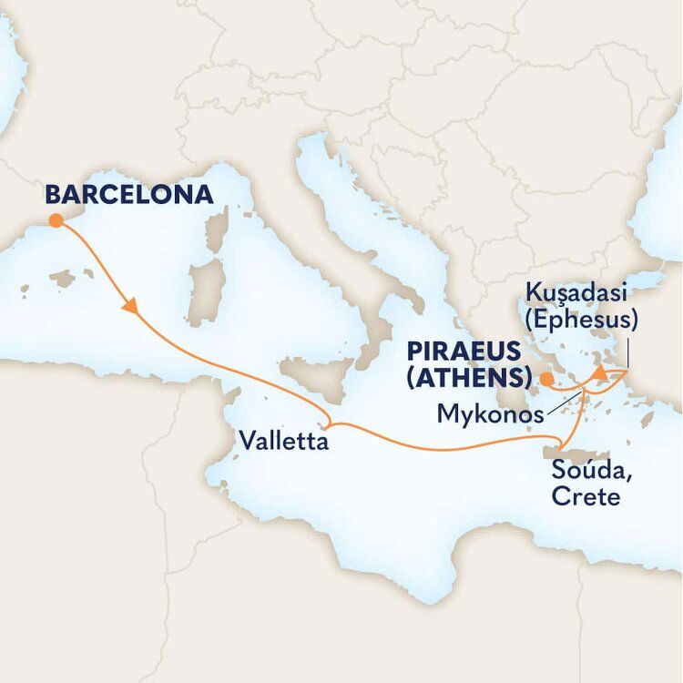 Souda Bay’s huge natural harbour is a spectacular entrance to Greece's largest island, Crete. Packed with beautiful beaches and rich maritime history, Crete is also a treasure trove of well-stocked museums, rich archaeological sites and charming Venetian fishing towns. Ships will dock at the Port of Souda.