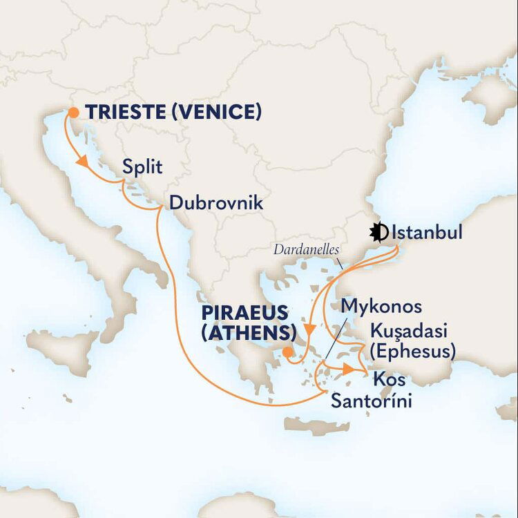 Venice is approximately 150 kilometers (93 miles) away, a journey that takes about 2 hours by train if you are making your own way to Trieste from Venice. Alternatively, your cruise documents will outline alternative transfer options.