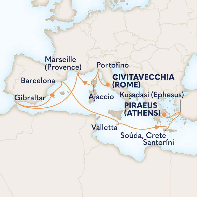 Souda Bay’s huge natural harbour is a spectacular entrance to Greece's largest island, Crete. Packed with beautiful beaches and rich maritime history, Crete is also a treasure trove of well-stocked museums, rich archaeological sites and charming Venetian fishing towns. Ships will dock at the Port of Souda.