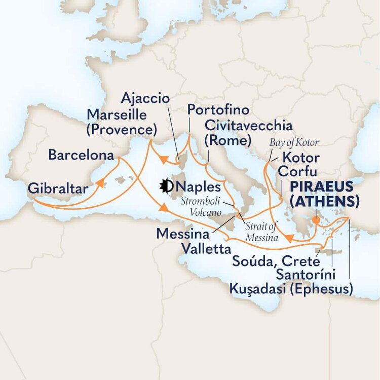 Souda Bay’s huge natural harbour is a spectacular entrance to Greece's largest island, Crete. Packed with beautiful beaches and rich maritime history, Crete is also a treasure trove of well-stocked museums, rich archaeological sites and charming Venetian fishing towns. Ships will dock at the Port of Souda.