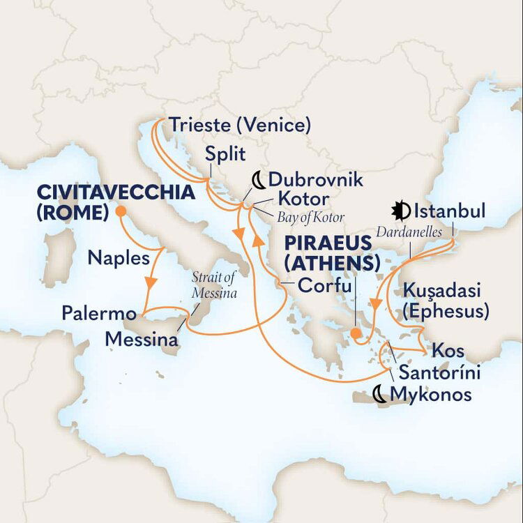 The lush and verdant island of Corfu lies in the Ionian Sea, midway between Greece and Italy. It is an island of sparkling beaches, mountains splashed with wildflowers, and historical, perched fortresses. Ships will dock at the town of Corfu.