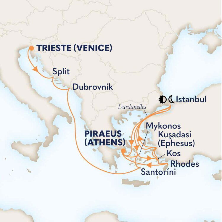 Venice is approximately 150 kilometers (93 miles) away, a journey that takes about 2 hours by train if you are making your own way to Trieste from Venice. Alternatively, your cruise documents will outline alternative transfer options.