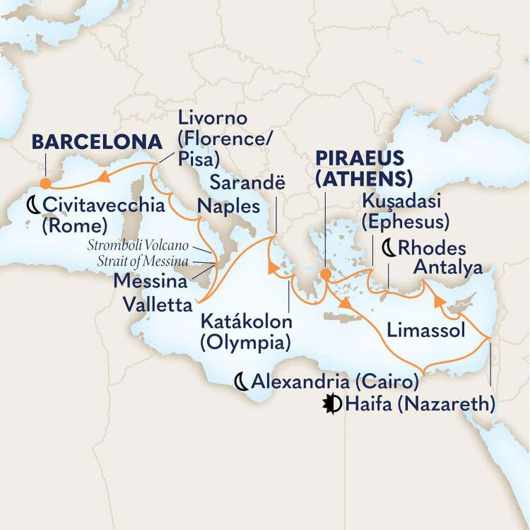 The vibrant city of Limassol is located on Akrotiri Bay in the shadow of the Troodos mountains. Its the jumping off point to explore the ancient riches of Cyprus. See ruins, majestic mountains and scenery, stunning beaches, and vast groves of lemons, oranges and olives. Ships will dock at the cruise terminal.