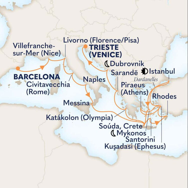 Souda Bay’s huge natural harbour is a spectacular entrance to Greece's largest island, Crete. Packed with beautiful beaches and rich maritime history, Crete is also a treasure trove of well-stocked museums, rich archaeological sites and charming Venetian fishing towns. Ships will dock at the Port of Souda.