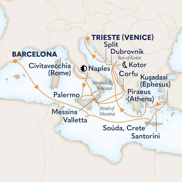 Souda Bay’s huge natural harbour is a spectacular entrance to Greece's largest island, Crete. Packed with beautiful beaches and rich maritime history, Crete is also a treasure trove of well-stocked museums, rich archaeological sites and charming Venetian fishing towns. Ships will dock at the Port of Souda.