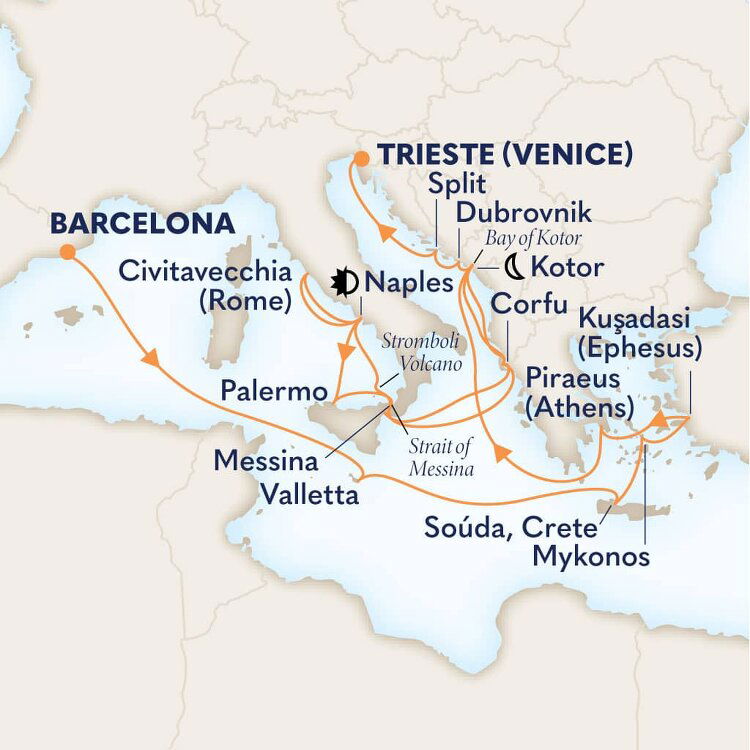 Messina is located on the northeastern corner of Sicily and is the panoramic gateway to the island. Sitting on a sickle-shaped harbour and under the gaze of Mt. Etna, the city is a patchwork of churches and antique palaces. Ships will dock at the cruise terminal.
