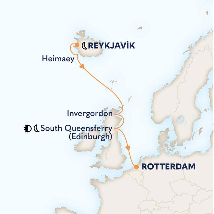 Located in the chilly and wild North Atlantic, it is common to see whales and seals in the surrounding waters. Puffins are also a common sight in summer, as the islands are considered as the largest Atlantic puffin colony in the world. Ships will dock in the main harbour.
