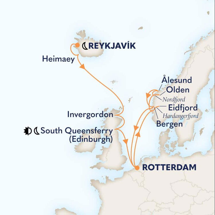 Located in the chilly and wild North Atlantic, it is common to see whales and seals in the surrounding waters. Puffins are also a common sight in summer, as the islands are considered as the largest Atlantic puffin colony in the world. Ships will dock in the main harbour.