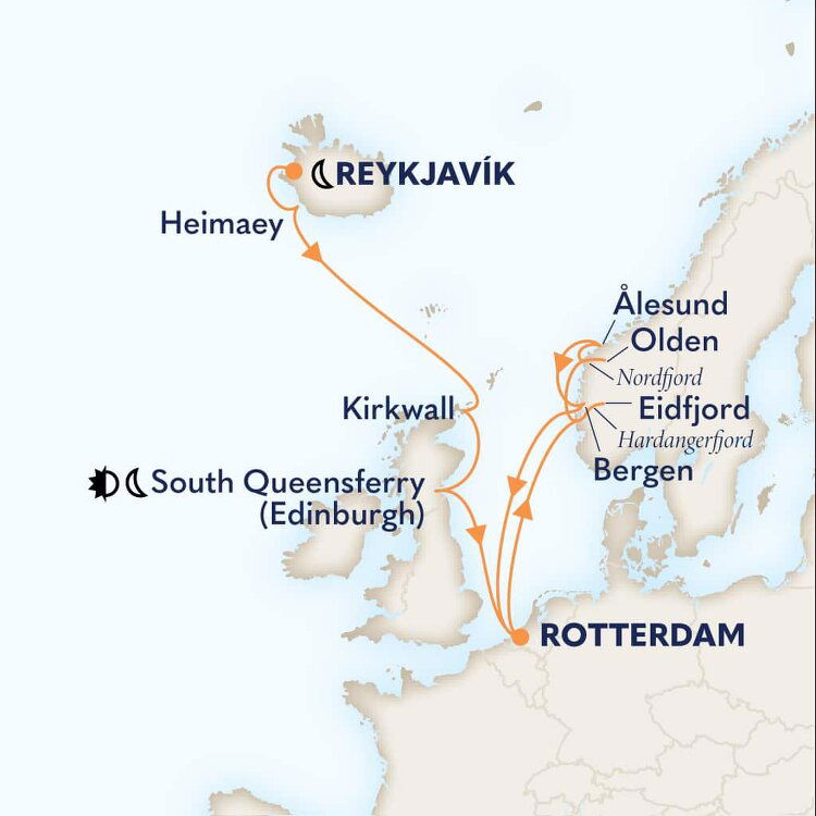 Located in the chilly and wild North Atlantic, it is common to see whales and seals in the surrounding waters. Puffins are also a common sight in summer, as the islands are considered as the largest Atlantic puffin colony in the world. Ships will dock in the main harbour.