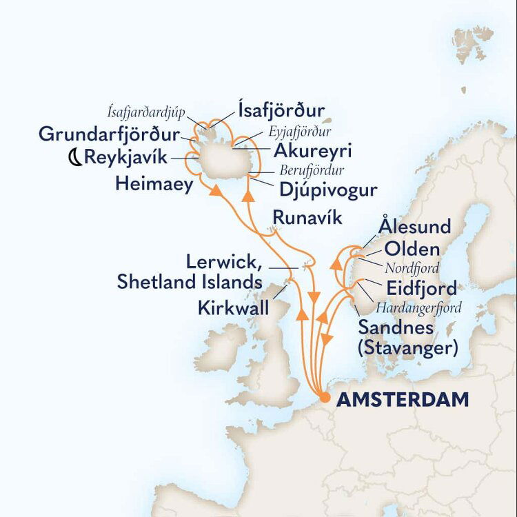 Located in the chilly and wild North Atlantic, it is common to see whales and seals in the surrounding waters. Puffins are also a common sight in summer, as the islands are considered as the largest Atlantic puffin colony in the world. Ships will dock in the main harbour.