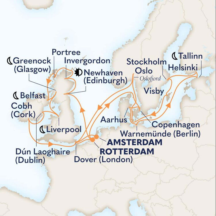 Nestled between the Highlands and the Border Hills, Edinburgh is a gracious city noted for its superb skyline, its impressive collection of architecture and its beautiful parks. Here you'll find the best of central eastern Scotland: spectacular views, rolling hills and castles. Ships will dock at the Port of Leith Cruise Liner Terminal.
