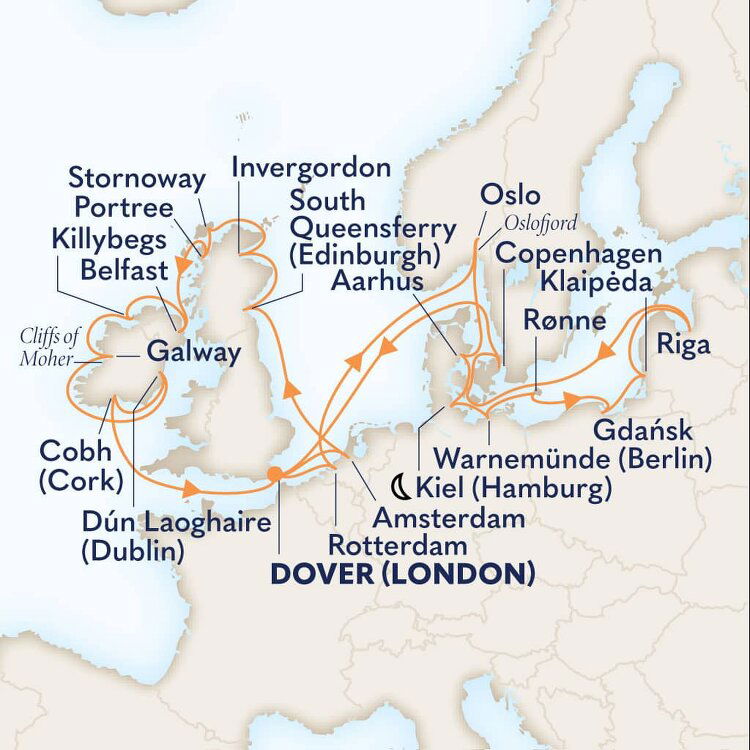 Known as the 'Gateway to England', the southeastern town of Dover is the main transit port between the two sides of the English Channel. This quaint and uniquely British town is famous for its impressive white cliffs, which have inspired many a poet and playwright. Ships will dock at the Dover Cruise Terminal.