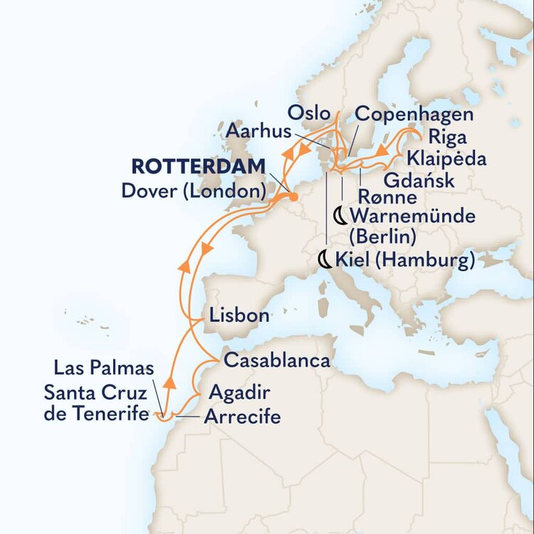 Warnemünde offers access to both the historic city of Rostock, just 13 kilometers (8 miles) away, and the vibrant capital, Berlin, approximately 240 kilometers (150 miles) away. Rostock is reachable within 20 minutes by train, while Berlin requires a longer travel time, about 3 hours by train or coach. Explore Rostock's medieval architecture and Hanseatic history or if you're looking to explore Berlin, plan for a full day experience.
