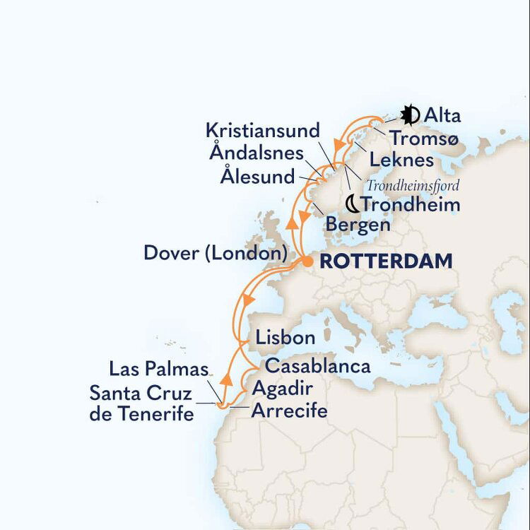Tucked into the Altafjord, Alta enjoys a warmer, drier climate than other ports in Northern Norway. Rugged landscapes roll down to meet the calm waters of its sheltered harbour, and local Sami culture thrives in one of the world’s most northerly cities. Ships will dock at this port.