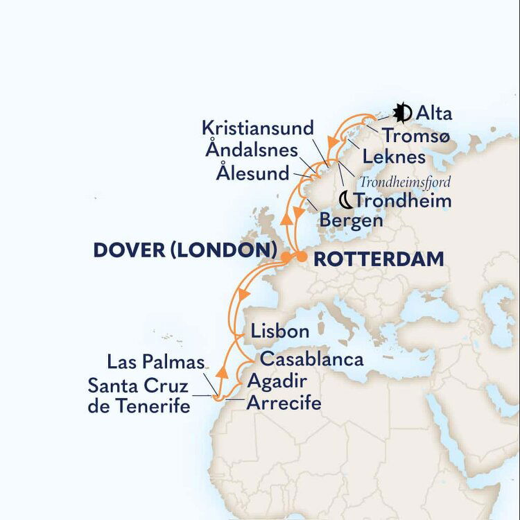 Tucked into the Altafjord, Alta enjoys a warmer, drier climate than other ports in Northern Norway. Rugged landscapes roll down to meet the calm waters of its sheltered harbour, and local Sami culture thrives in one of the world’s most northerly cities. Ships will dock at this port.