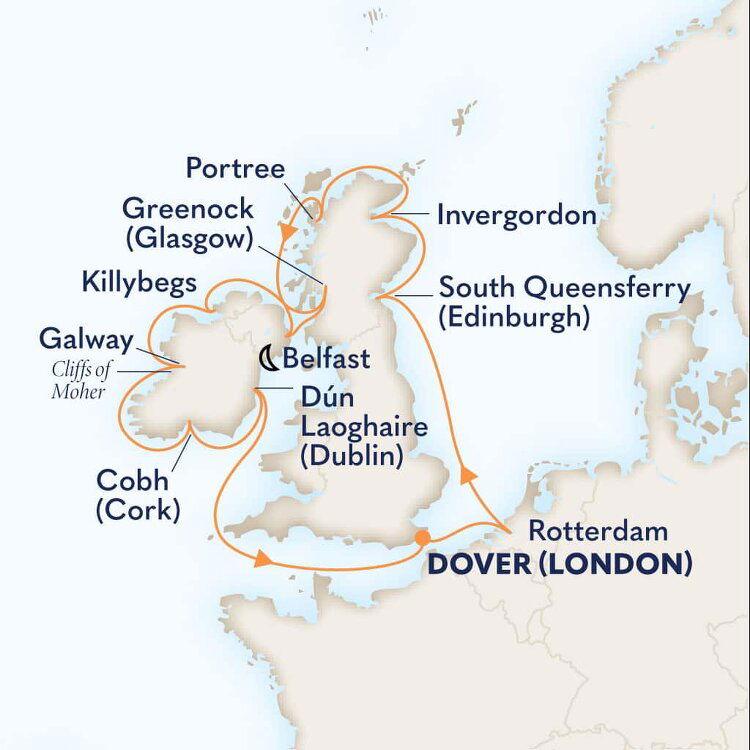 Northern Ireland's capital, Belfast, enjoys a wonderful setting of high hills, sea lough and river valley. Reborn as a cool, modern city, it has successfully left its troubles behind, emerging as a hotbed of culture and architecture, where the comfort of a cosy pub is never far away. Ships will dock in Belfast Harbour.