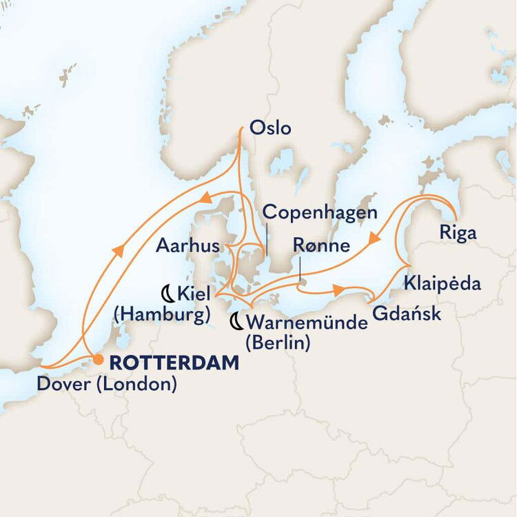 Warnemünde offers access to both the historic city of Rostock, just 13 kilometers (8 miles) away, and the vibrant capital, Berlin, approximately 240 kilometers (150 miles) away. Rostock is reachable within 20 minutes by train, while Berlin requires a longer travel time, about 3 hours by train or coach. Explore Rostock's medieval architecture and Hanseatic history or if you're looking to explore Berlin, plan for a full day experience.