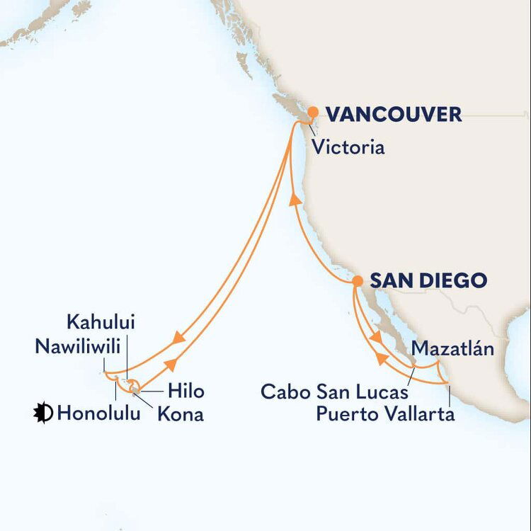 Cabo San Lucas is the sunny resort town on the tip of Mexico’s Baja California. This colourful small town is known for its excellent big-game fishing, great diving spots and challenging surf waves. Ships will anchor offshore in Cabo San Lucas bay and tender guests to shore.