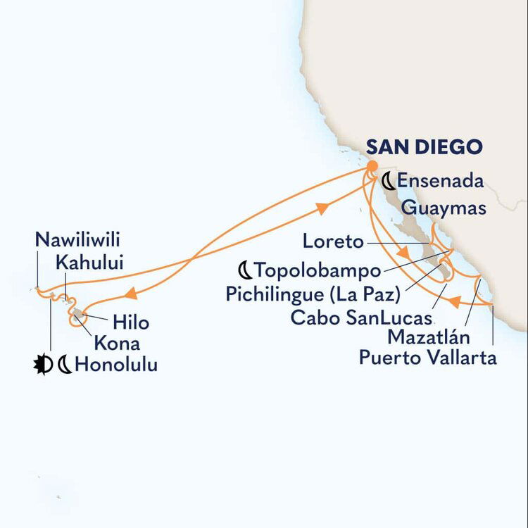 Cabo San Lucas is the sunny resort town on the tip of Mexico’s Baja California. This colourful small town is known for its excellent big-game fishing, great diving spots and challenging surf waves. Ships will anchor offshore in Cabo San Lucas bay and tender guests to shore.
