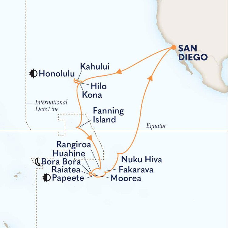 The island's unique geography makes Moorea one of French Polynesia's most breathtaking islands. Eight mountain peaks carpeted in lush vegetation rise from a translucent lagoon and two tranquil bays. Ships will anchor offshore and tenders will be provided to the shore.
