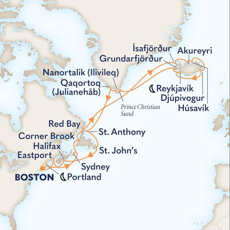 Nanortalik is located on a small island in the southern tip of Greenland. It is an adventurer's wonderland with vertical cliff walls, sheets of floating sea ice and a plethora of Arctic wildlife, including seals and Minke, humpback and fin whales. Sometimes polar bears can also be spotted on the offshore flow of ice. Ships will anchor offshore and tender guests to shore.