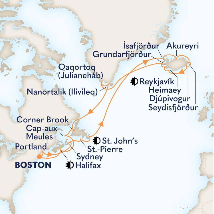 Nanortalik is located on a small island in the southern tip of Greenland. It is an adventurer's wonderland with vertical cliff walls, sheets of floating sea ice and a plethora of Arctic wildlife, including seals and Minke, humpback and fin whales. Sometimes polar bears can also be spotted on the offshore flow of ice. Ships will anchor offshore and tender guests to shore.