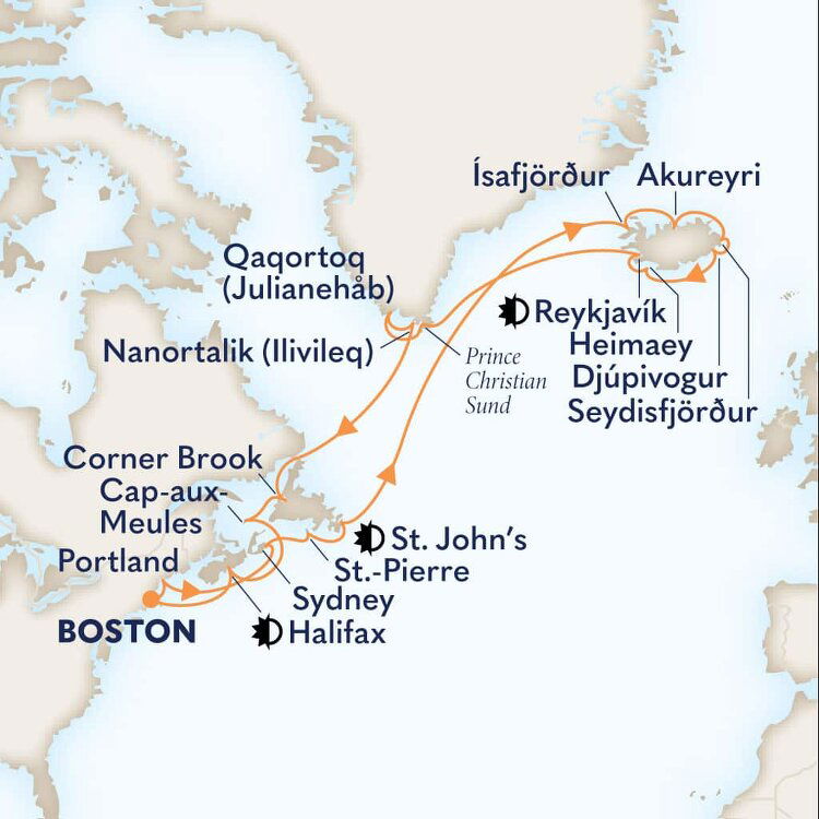 Located in the chilly and wild North Atlantic, it is common to see whales and seals in the surrounding waters. Puffins are also a common sight in summer, as the islands are considered as the largest Atlantic puffin colony in the world. Ships will dock in the main harbour.