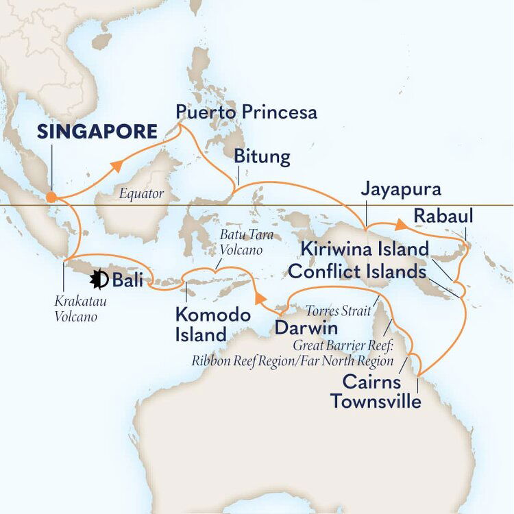 Bring your binoculars to the bow for an unforgettable scenic cruising experience. Glide the serene Flores Sea passing remote Komba Island, part of the Lesser Sunda Islands of Indonesia. Only about 10 miles (17 kilometers) across, it is famous for one thing—Mt. Batu Tara, a stratovolcano that dramatically erupts every 20 minutes. Though it’s smaller than Krakatoa, it puts on quite the show. Witness the awesome power of nature as a massive plume of ash bursts hundreds of feet into the air and lava rocks tumble to the sea. Listen to the rumble and roar of one of nature’s most powerful forces. On July 1, 2006, Batu Tara came to life after a long period of inactivity. Now it dazzles visitors with strombolian eruptions round the clock. Keep your camera ready. Batu Tara is spectacular even when it’s not erupting.