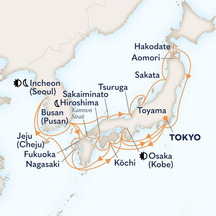 Known for its ancient temples and beautiful beaches, Fukuoka is the capital of and gateway to Kyushu Island. Boasting Japan’s heady cocktail of hot springs, gourmet food, abundant nature and spiritual history, Kyushu Island has all the advantages of the mainland, while enjoying its own identity. Ships will dock at Hakata Port.