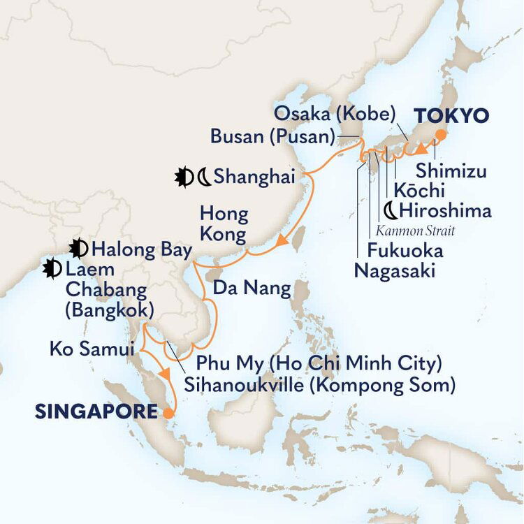 Known for its ancient temples and beautiful beaches, Fukuoka is the capital of and gateway to Kyushu Island. Boasting Japan’s heady cocktail of hot springs, gourmet food, abundant nature and spiritual history, Kyushu Island has all the advantages of the mainland, while enjoying its own identity. Ships will dock at Hakata Port.