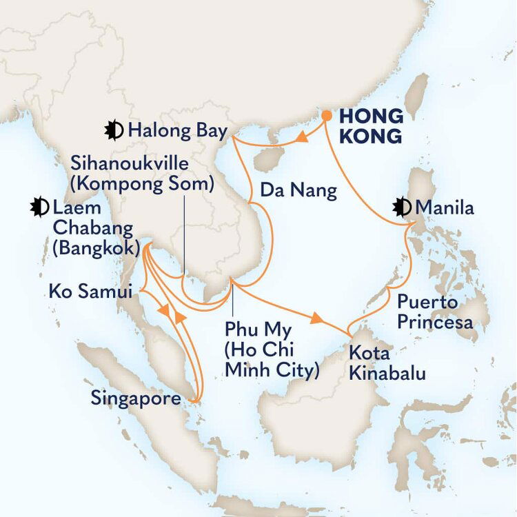 The capital city of Palawan Island in the Philippines is a fascinating landscape of caves, forests, and coastline. Often acclaimed as the cleanest and greenest city in the Philippines, it offers a wealth of attractions such as turquoise water, white-sand beaches, underground rivers, and wildlife reserves. Ships will dock at the port.