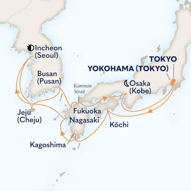 Known for its ancient temples and beautiful beaches, Fukuoka is the capital of and gateway to Kyushu Island. Boasting Japan’s heady cocktail of hot springs, gourmet food, abundant nature and spiritual history, Kyushu Island has all the advantages of the mainland, while enjoying its own identity. Ships will dock at Hakata Port.