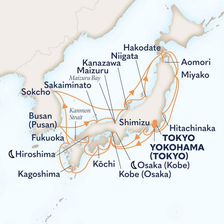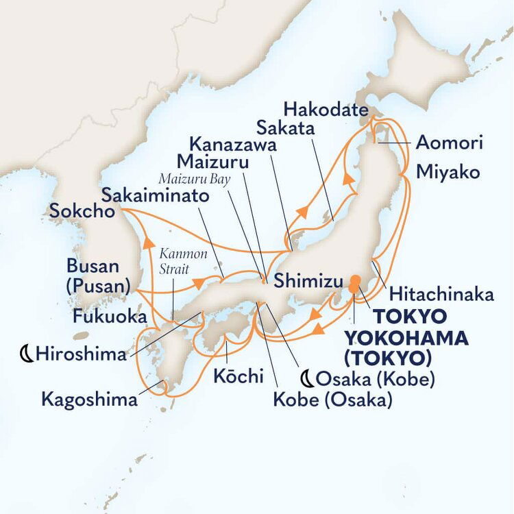 Known for its ancient temples and beautiful beaches, Fukuoka is the capital of and gateway to Kyushu Island. Boasting Japan’s heady cocktail of hot springs, gourmet food, abundant nature and spiritual history, Kyushu Island has all the advantages of the mainland, while enjoying its own identity. Ships will dock at Hakata Port.
