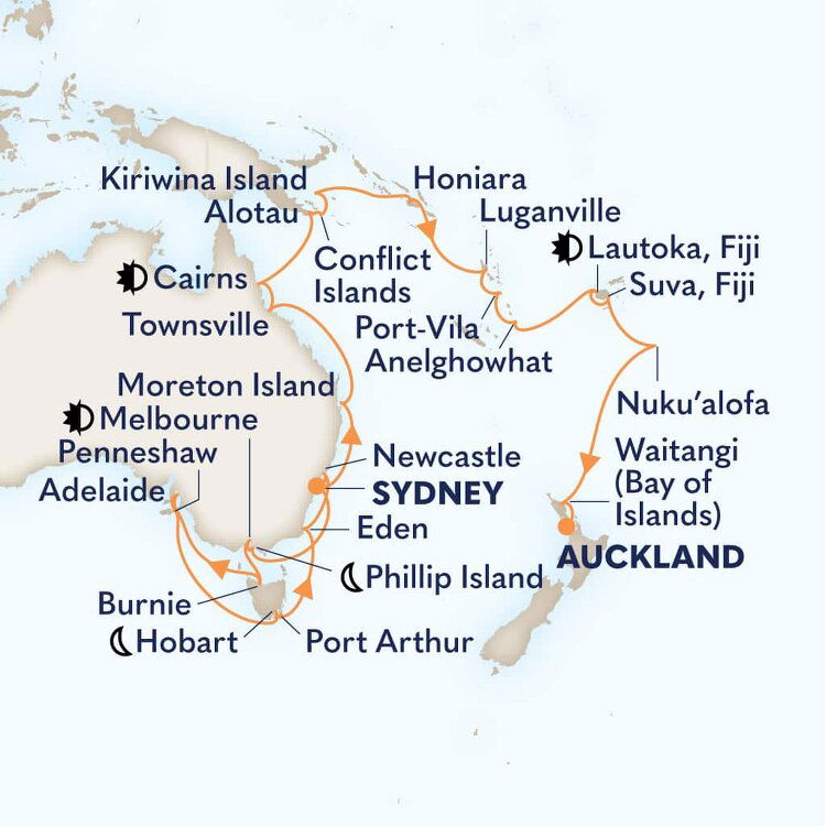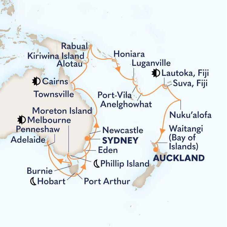 Set in Twofold Bay on the Sapphire Coast, Eden is known for the migrating whales that cruise through its waters between May and November. While the whales are now protected and cherished here, the town was initially founded as a whaling centre and has many fascinating stories to tell. Ships will anchor offshore and tenders are provided to the port.