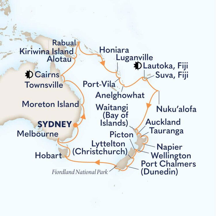 The Bay of Islands, a stunning archipelago encompassing 144 islands and including the boutique towns of Opua, Paihia, Russell and Kerikeri, is famed for its turquoise waters and rich Māori history. Take a boat tour to explore the iconic Hole in the Rock or spot dolphins. Visit Russell, a picturesque town with colonial history, or the Waitangi Treaty Grounds, where New Zealand’s founding document was signed. Your ship will anchor in the bay, just off Russell, and you'll tender ashore.