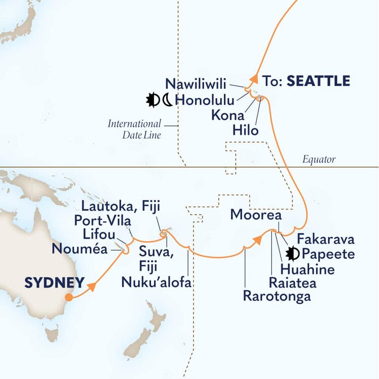 The island's unique geography makes Moorea one of French Polynesia's most breathtaking islands. Eight mountain peaks carpeted in lush vegetation rise from a translucent lagoon and two tranquil bays. Ships will anchor offshore and tenders will be provided to the shore.