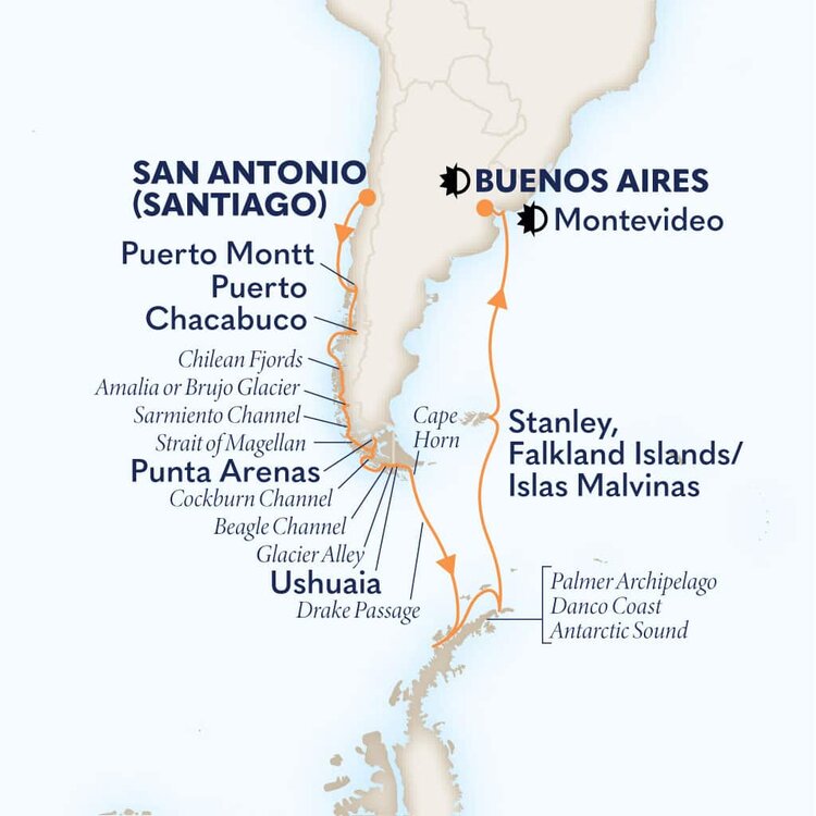 Your ship will anchor in Port Stanley’s harbor and you'll be tendered ashore. The town center is just a short walk from the tender pier, allowing for easy exploration on foot. This charming capital of the Falkland Islands offers a glimpse into British heritage with its quaint streets and vibrant wildlife. Visitors can enjoy a variety of activities, from visiting the historic Christ Church Cathedral and the Whalebone Arch to exploring the Falkland Islands Museum. Wildlife enthusiasts will appreciate the nearby Gypsy Cove, just 7 km (4.3 miles) away and home to Magellanic penguins and other seabirds.