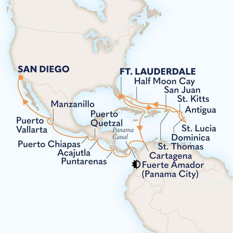 Fuerte Amador, located at the Pacific entrance to the Panama Canal, is a man-made peninsula extending into the Pacific Ocean. The one-mile (1.6km) causeway is formed by connecting four small islands with rocks from the canal, and hosts shops and restaurants around a marina which serves as a tender dock to visiting ships. Offering panoramic views of Panama City's skyline, the causeway is also home to the Smithsonian Institute of Tropical Research. The tender dock is conveniently located, providing easy access to Panama City with a transfer time of around 25 minutes (14km/8.5mi distance).