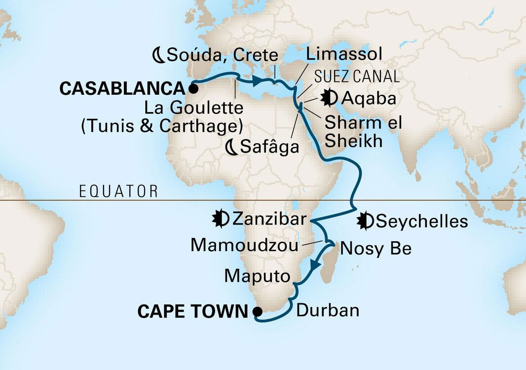 Enjoy the breathtaking illusion of sailing through oceans of desert sand as you cruise the Suez Canal, the engineering marvel that connects the Mediterranean and Red Seas.