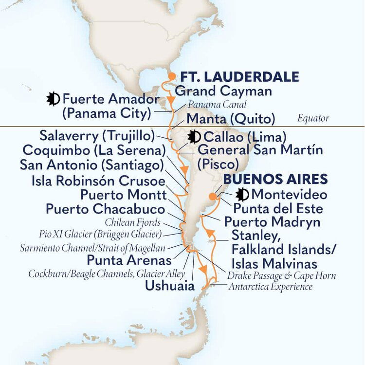 Located at the southernmost end of South America, Ushuaia is is often called a doorway to Antarctica. The town boasts incredible natural beauty through its national parks like the Tierra del Fuego National Park with cultural institutions like the Museo del Fin del Mundo, or the End of the World Museum. Ships will dock at this port.