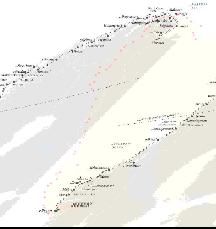 As we call into the northern city of Bodø, gaze up at the snow-capped Børvass peaks before experiencing the fabulous street art this city has to offer. From here, we continue across the Vestfjord and towards the Lofoten archipelago which greets you with the stunning sight of the 1,000 metre-high Lofoten Wall.