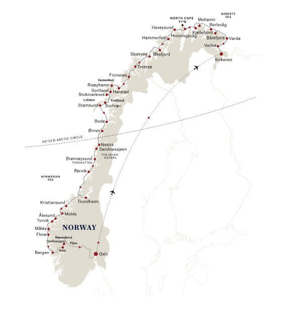 After breakfast, it's time to check out of your hotel and get on the Flytoget train to the airport where you board the plane heading north. You'll fly the length of Norway's mainland to Kirkenes, from around 60 to 70 degrees north. When you step off the plane, you're approximately 400km north of the Arctic Circle, on the very edge of Norway.