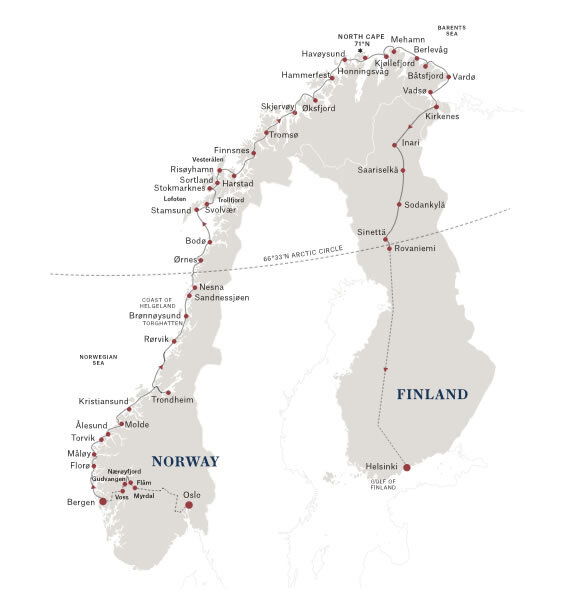 We'll arrive at Vardø in the morning, and we'll continue south towards our next port, Kirkenes. You'll be treated to dramatic coastal vistas as we approach the shore. Here, we leave our ship behind as we continue our journey south toward Finland on land.