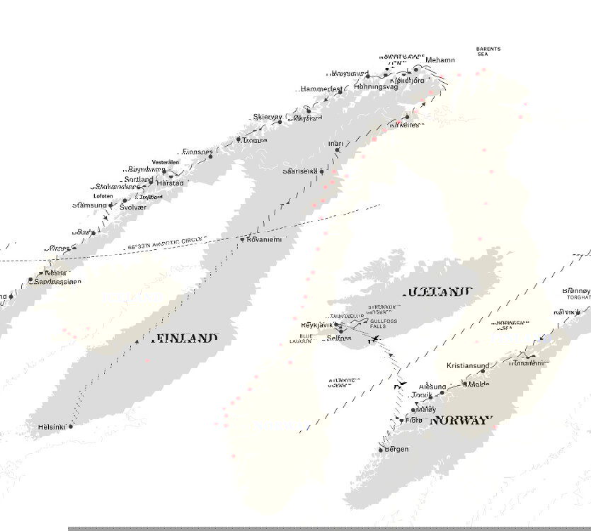 Continuing south along Norway's rugged coast, we pass Øksfjord and arrive at Skjervøy, a bustling fishing port we've been visiting since 1896. As we approach Tromsø, you'll enjoy glimpses of the majestic Lyngen Alps, home to some of Norway's highest peaks. The city welcomes us just before midnight – but don't let the hour put you off, you can explore the lively streets under the endless light of the Midnight Sun.