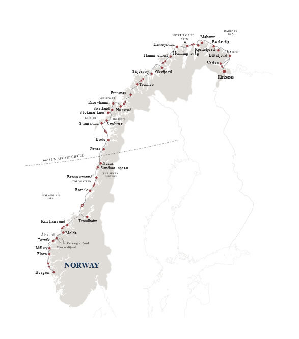 We make stops at Mehamn and Kjøllefjord during the night before early-morning visits to Honningsvåg and Havøysund.