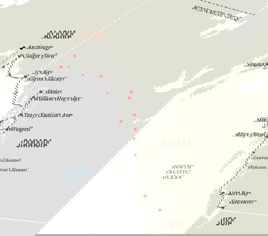 The Inside Passage coastal route takes us through the great North American Pacific Fjordland, a protected stretch of water over 930 miles long. Unlike other cruises which pass through at night, you'll be able to view the sublime scenery in all its glory during the day.